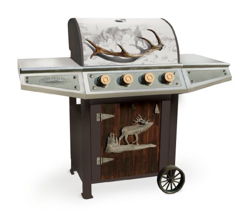 This is a grill big game hunters can be proud to call their own. It is a work of art that speaks to the freedom and camaraderie of the outdoor lifestyle, the enduring memories of great adventure, and the heart and soul of the true outdoorsman. Crafted with materials like brushed stainless steel, solid wood, and state-of-art alloys and composites. The acid-etched hood image depicts a hardened western hunter of old times making his way through the mountains with his trophies carried by his only two companions for miles; his mule and his horse. The trail is rough, but he wouldn't rather be anywhere else in the world but with his rifle and horse, hunting big game, hunting his passion. Black enameled firebox, cast iron grates and a stainless steel warming rack, 600 square inch cooking surface, a four burner design with push and turn ignition. 12,000 BTU output per burner for cooking your steak or chop to absolute perfection. The grill has a distressed, fire-charred wood door, along with a vintage, weathered-metal, bugling elk door plate. The wheels are vintage wagon-style rubber clad alloy. Several huntsman touches: big game hunting scene permanently acid-etched into the 304-gauge stainless steel hood, hand-painted, cast-alloy, elk antler hood handle, "rifle casing" burner controls. . The grill weighs 129 pounds.